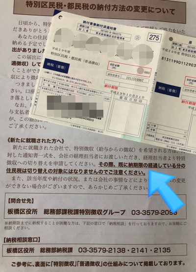 당시에 저는, 9월15일로 회사1을 그만두었으니, 10,11,12월(3분기:46000엔)과 1월,2월,3월(4분기:46000엔)로 구성된 주민표납세지로용지가 2장 날아옵니다. 이중 3분기는 10월30일이 납부 기한이어서 내버렸습니다. 취직이 됐을 때는, 남은 4분기용 지로용지만 총무과에 제출하면 됩니다. 입사 후 한 2주후 정도에 특별징수로 바뀌었다고 구약소에서 연락이 우편으로 오더라구요. 이거는 총무과나 인사담당자에게 딱히 통지받은 건 아니었습니다. 저도 이렇게 하는지는 몰랐는데, 10월에 지로용지 날라 왔을 때 거기 안에 들었던 안내문에 이와 같은 내용이 써있었기 때문에 그대로 했습니다.